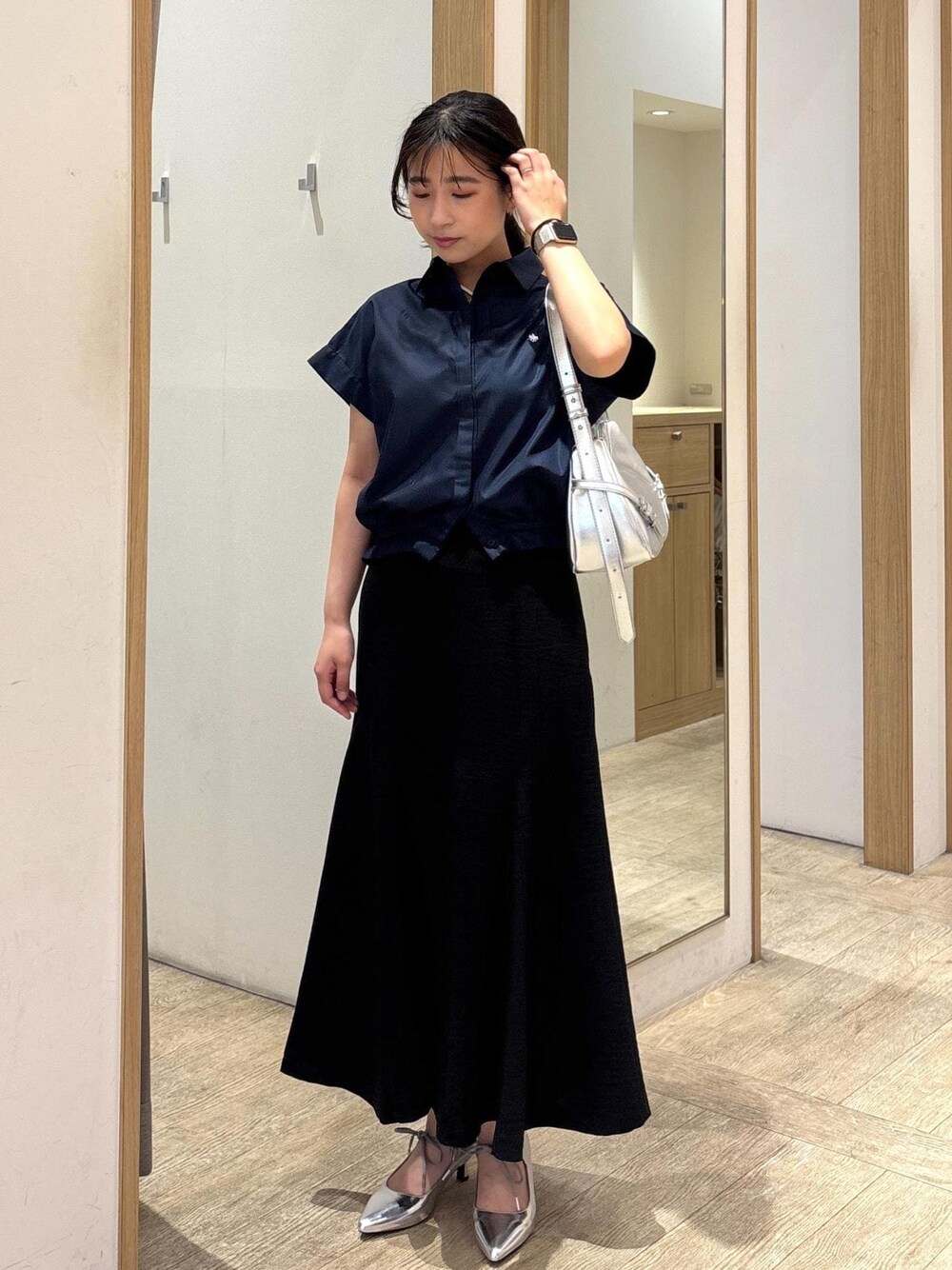 ダークトーンのコーデにシルバー小物でアクセントをつけたPOLO BCSブラウスコーデです。 ブラウスはデニムや明るめのタイトスカートと合わせてカジュアルにも◎ スカートはセットアップのトップスとジャケットがございます。 着回しコーディネートを載せてますので、ぜひご覧ください!