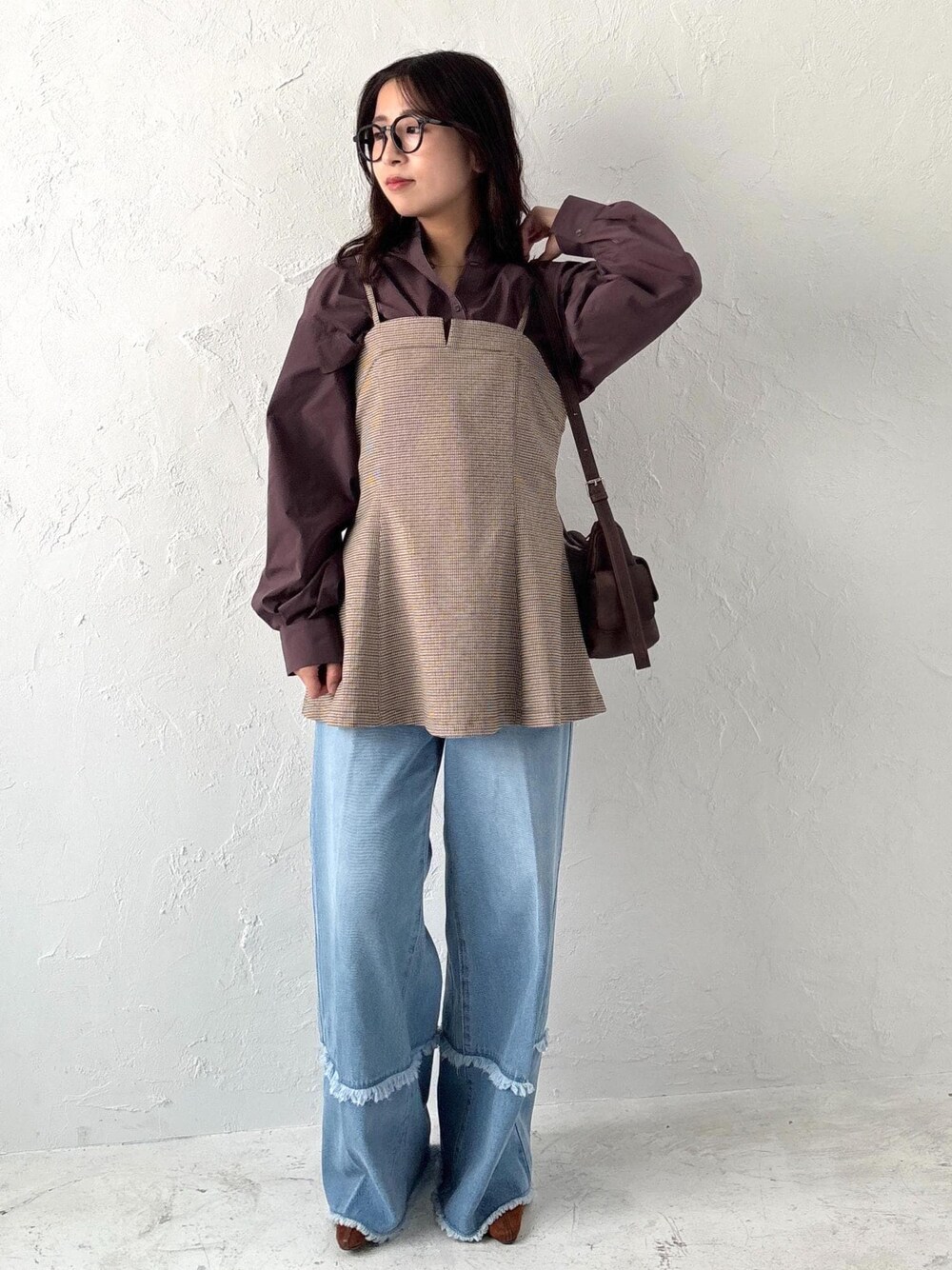 夏に活躍したブルーデニムを秋見えさせるブラウンコーデです。 低身長ウェーブも張りがあるシャツを、ビスチェと明るいボトムスで着られてる感なくハンサムに着こなせます☺︎ ブラウスはティアードデザインで着映えするので、インナーを合わせて1番外側の羽織としても◎ デニムはボリュームがあるのでリブニットなど、コンパクトなものとあわせてもバランスがとりやすい☺︎ 着回しコーディネートを載せてますので、ぜひご覧ください!