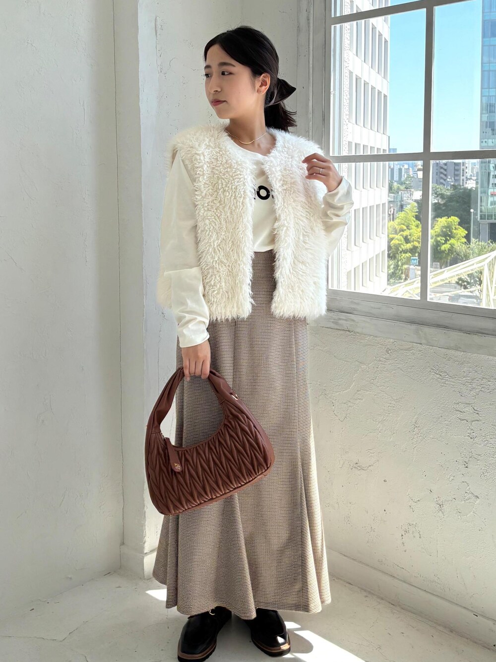 一枚で主役になるファーベストをTシャツ合わせでナチュラルなコーデにしました。 短めの毛足のコンパクトな丈感で、低身長もファーベストを着られてる感なくナチュラルに着こなせる◎ ベストはデニムと合わせればよりカジュアルに◎ スカートはセットアップのジャケットがございます。 着回しコーディネートを載せてますので、ぜひご覧ください!