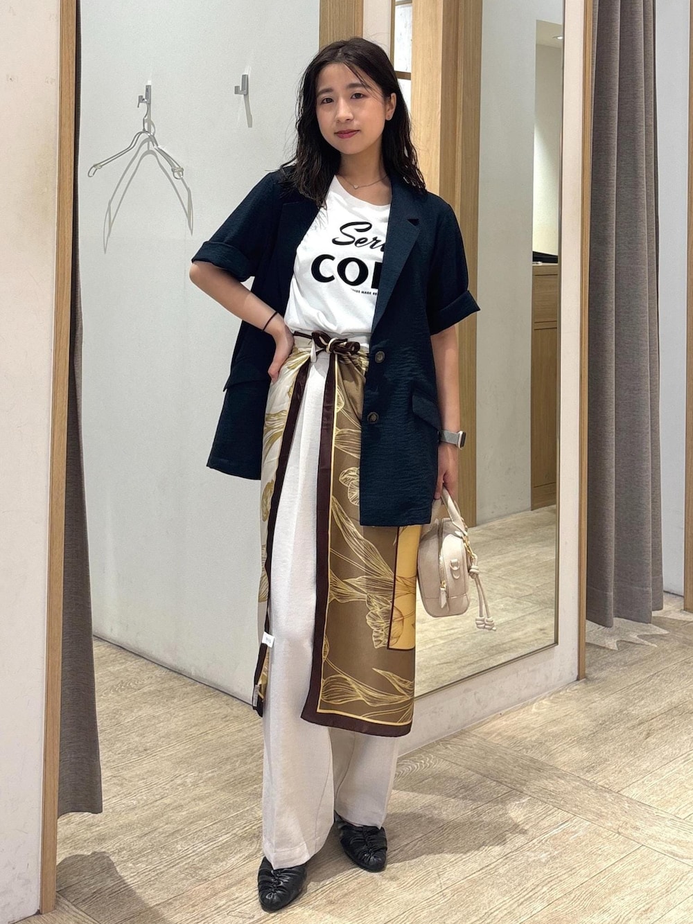 涼しいのに秋見えする大人のTシャツスタイルです。 長めのスカーフを腰に巻くことで脚が長く見えて、低身長もスタイルアップ間違いなし◎ ジャケットはブラウスと合わせてお仕事にも◎ パンツは太すぎないワイドパンツなので、ボリュームのあるトップスと合わせてもバランスが取りやすいです☺︎ 着回しコーディネートを載せてますので、ぜひご覧ください!