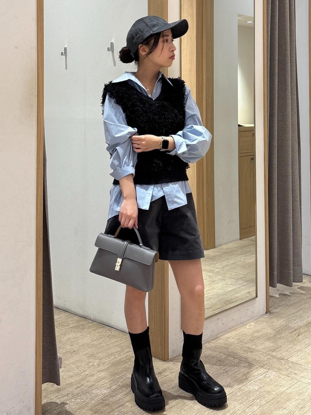 シャツとベストのレイヤードでショートパンツを大人っぽく見せるコーデです。 ベストは1枚でトップスとしても◎毛足が長すぎずボリューミーにならないので、低身長も着やすいです☺︎ ショートパンツはボリュームのあるスウェットやニットと合わせてもかわいい☺︎スエード素材なので冬も使いやすいデザインです! 着回しコーディネートを載せてますので、ぜひご覧ください!