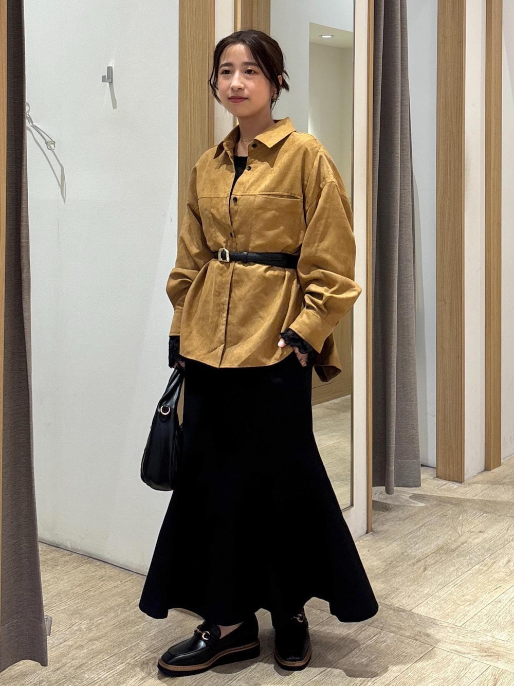女性らしく見えるマーメイドスカートをオーバーサイズのスエードシャツでハンサムに見せるスカートスタイルです。 スエードは柔らかい素材で低身長ウェーブも着られてる感なく着こなせるのが嬉しい!前を開けてTシャツと重ね着しても可愛いです☺︎ マーメイドスカートは綺麗めなブラウスと合わせてお仕事にも◎ 着回しコーディネートを載せてますので、ぜひご覧ください!