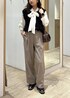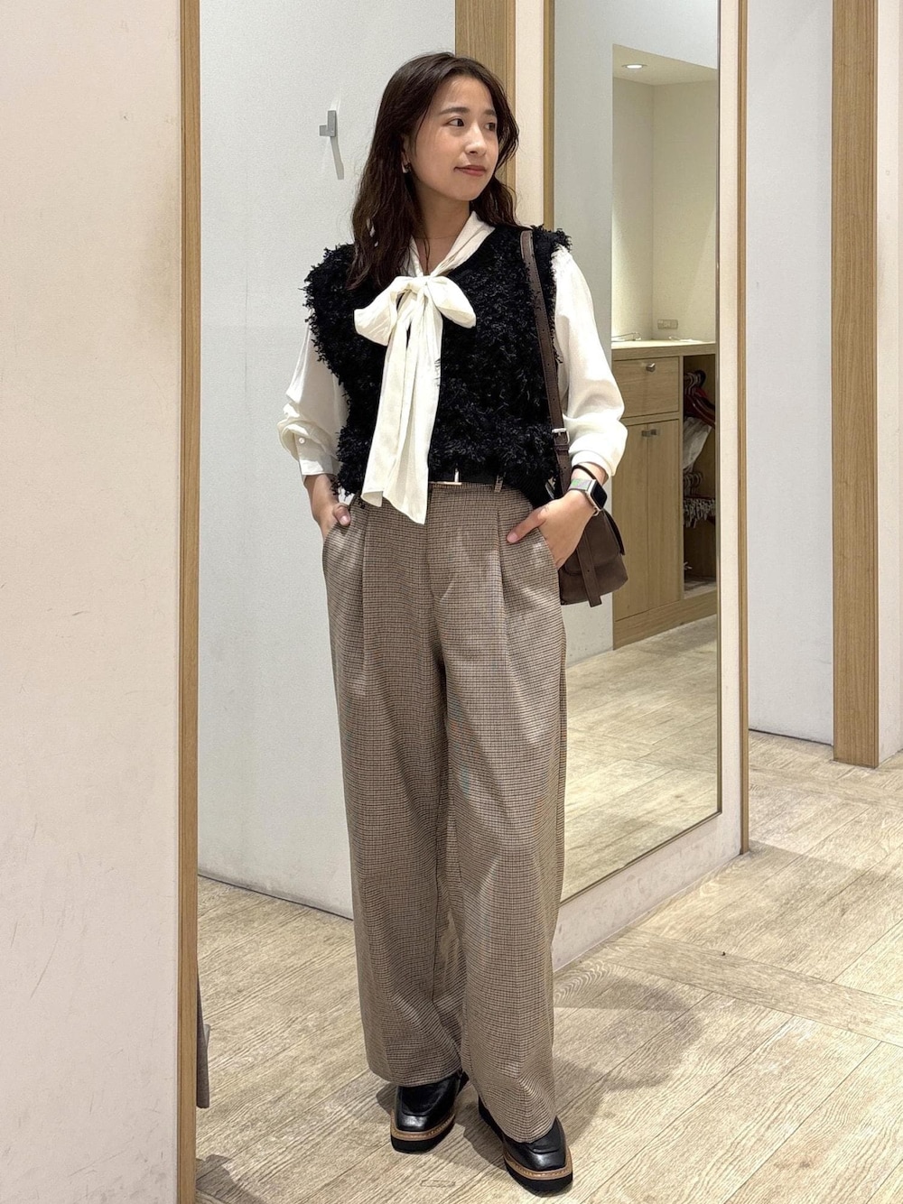 低身長も履きやすいワイドパンツを使ったおしゃれお仕事スタイルです。 目線が上がるリボンタイと小柄さんに嬉しいSSサイズのパンツでスッキリスタイルアップ! ブラウスはデニムやショートパンツと合わせて普段着にもおすすめです☺︎ パンツはセットアップのジャケット(BVV65100)がございます。 着回しコーディネートを載せてますので、ぜひご覧ください!