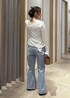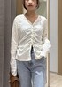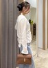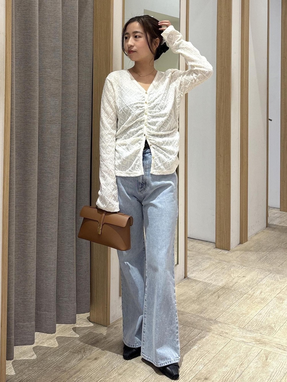胸元の抜け感のあるカーディガンと、脚長効果のあるフレアデニムで低身長ウェーブの着痩せコーデです。 カーディガンは胸元の空きが気になりますが、ネックレスをつければ程よい抜け感に◎ フレアデニムは優しいカラーで目線が下に行きづらく、下半身重心にならない、形も相まって脚がキレイに見えます。 カーディガンはフロントのギャザーがアクセントになるので上にアウターを羽織っても着映え感そのまま! 着回しコーディネートを載せてますので、ぜひご覧ください!
