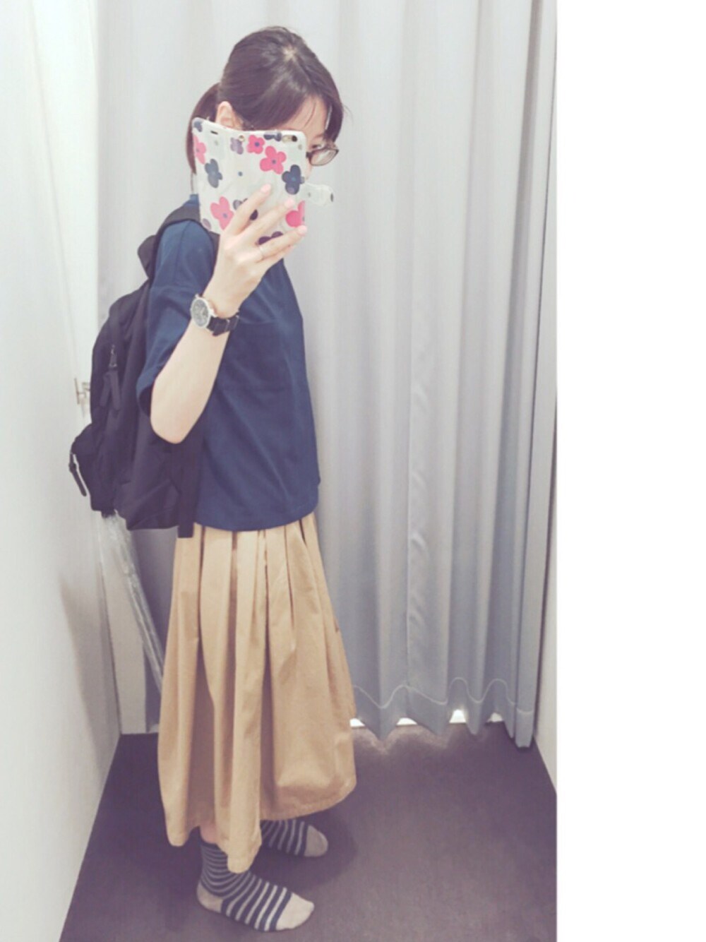 試着室からこんにちは😅 ネイビー×ベージュ 靴下と同じ色合わせ 時計は何年か前の 雑誌の付録の時計⌚️ Tシャツ:UNIQLO 靴下:無印良品