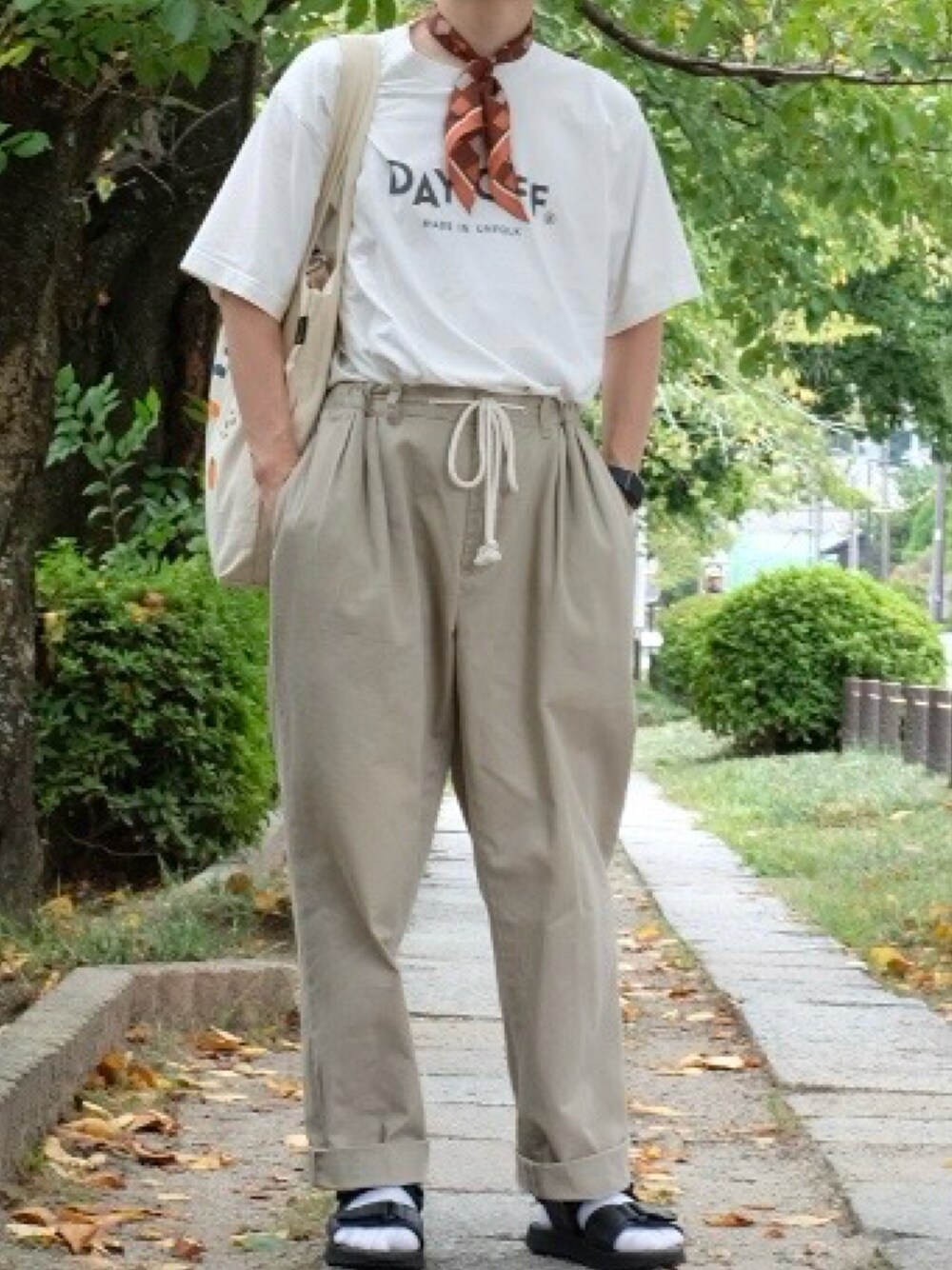 イージーパンツにタックインのリラックススタイルで哲学の道をぶらり🚶 古着で買ったラルフローレンのパンツが、楽なのにシルエットが良くてヘビロテ確定◎