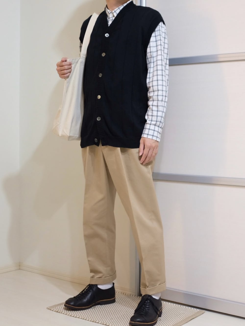 上品なコットン生地が魅力のベストをメインに組んでみました! ハリツヤあるチノパンとウィンドウペンチェックのシャツを合わせると、それだけで様になったので、普段使いのトートバッグを合わせて完成◎