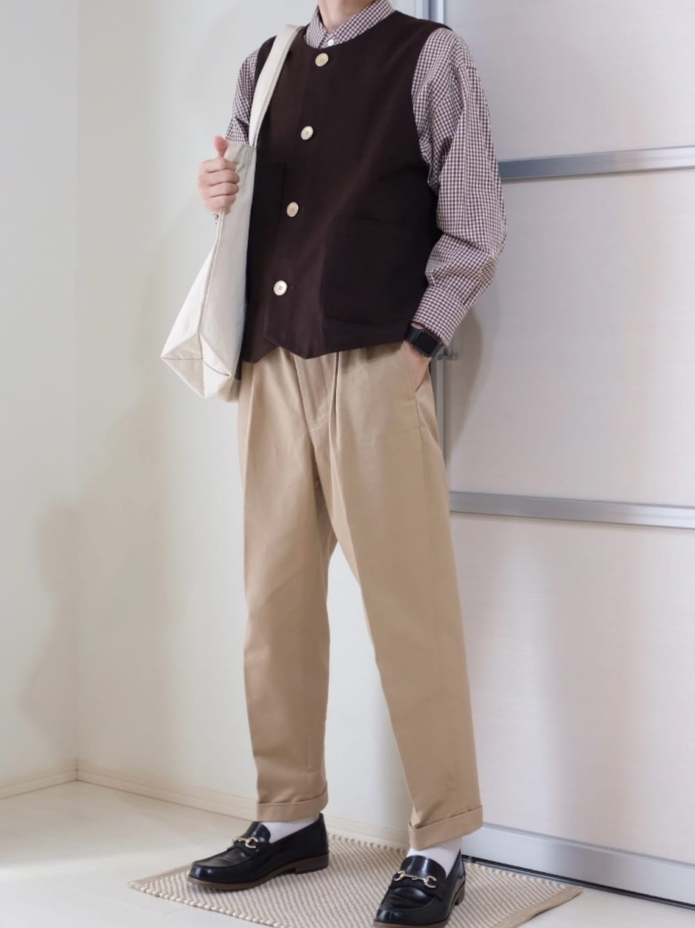 UNFOLKの2025AWのブラウンベストが着たくて組んでみました!同系色のチェックシャツとチノパンを合わせて、秋らしいトラッドスタイルに🇬🇧