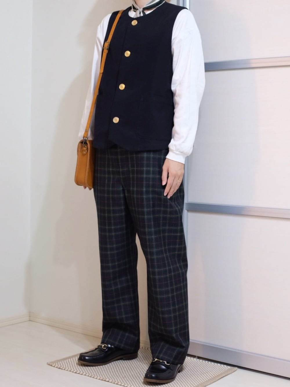 UNFOLKのドレスベストとチェックパンツでクラシカルな雰囲気にまとめました!キャメルのバッグで遊び心をプラス◎
