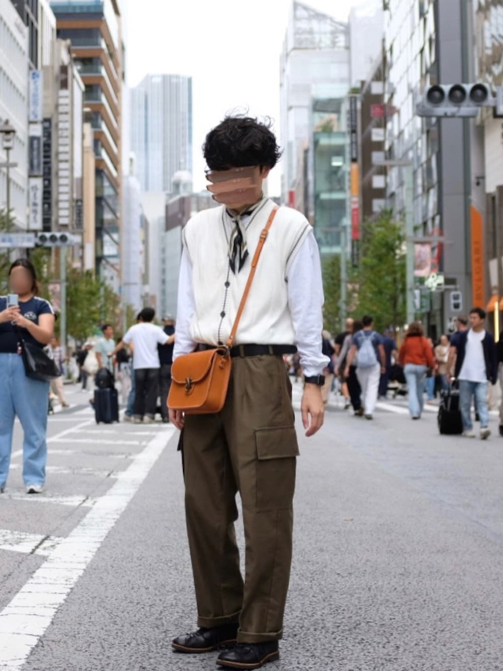 きれいめミリタリーパンツにかわいいラインのニットベストを合わせたコーデ🍃 キャメルのショルダーバッグで遊び心をプラス◎