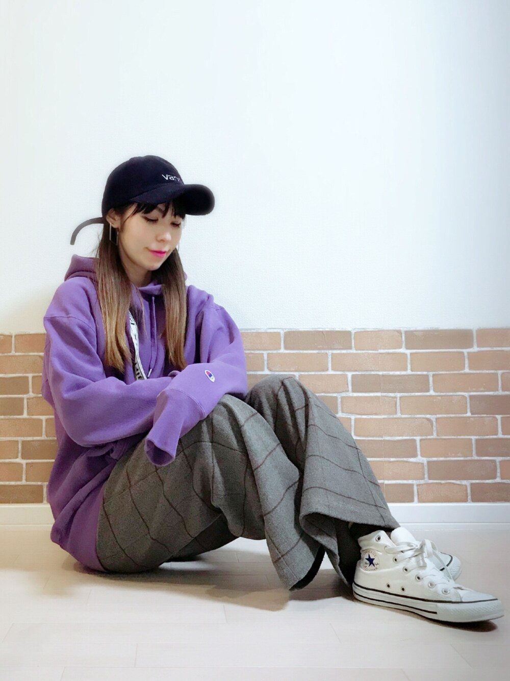 おはようございます🌞 今度は室内で座る。 本当はvansのキャップかぶったからvansのスニーカー履きたかった♡ パープル💟にグレンチェック💜 いつもありがとうございます☺︎