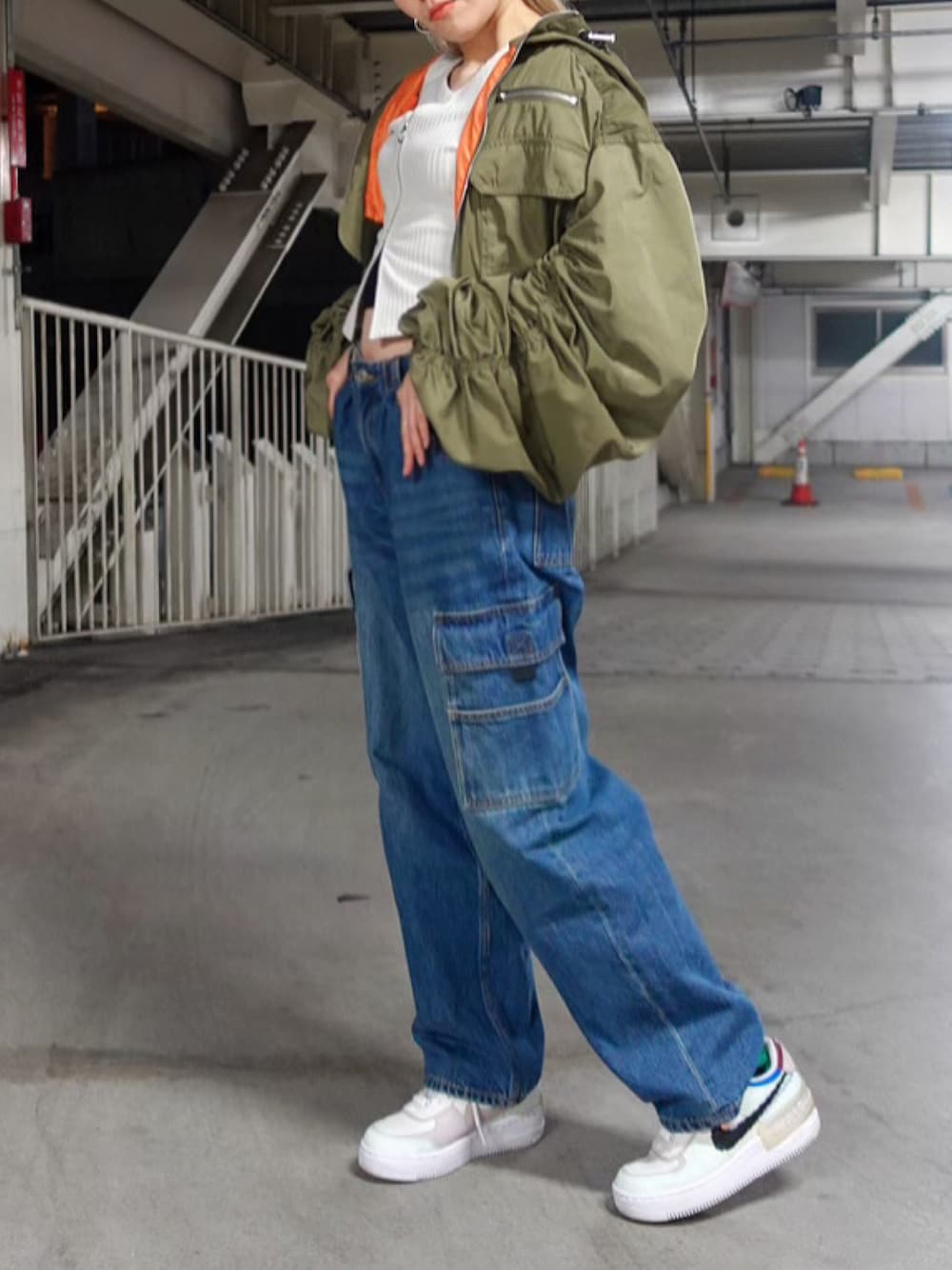 クロップド丈のアウター、トップスにカーゴパンツ✨ トレンド感満載のストリートコーデです✨