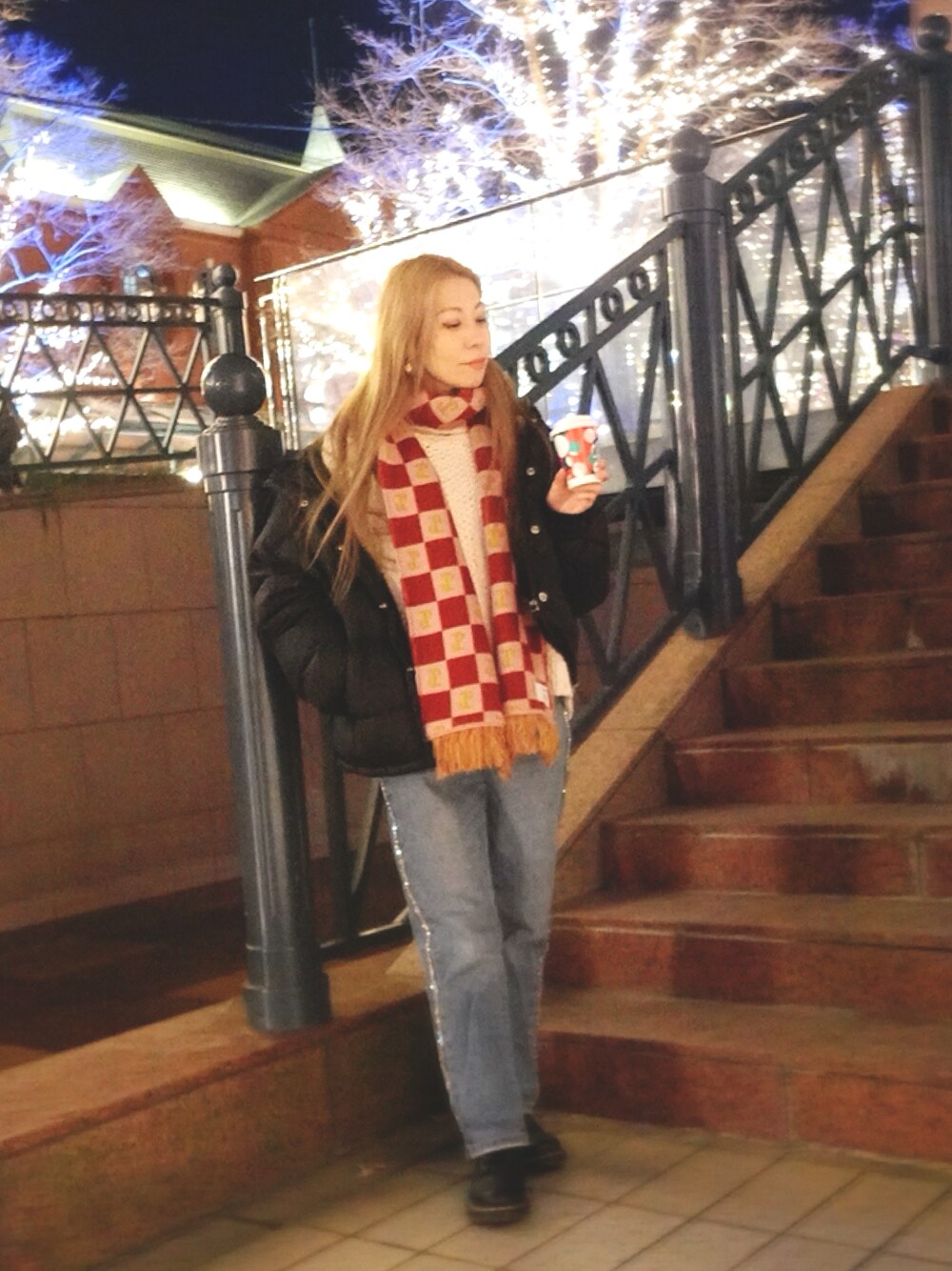クリスマスな色使いに、クリスマスっぽいニット✨️ デニムはラインストーンが装飾されていて華やかです🎄 恵比寿ガーデンプレイス🎄🪄︎︎⛄️🎄