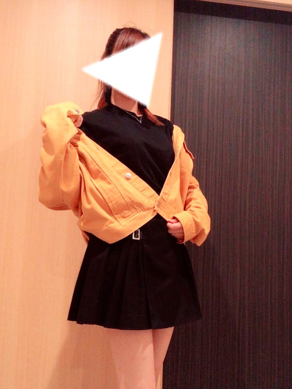 この間H&Mで買ったイエローのデニムジャケットを着たくて着たくて😂 弟から借りた黒Tに黒のスカートを合わせました♡