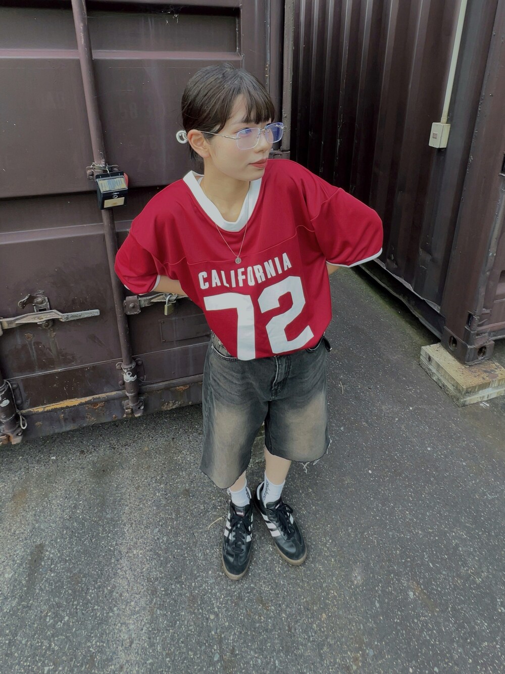 スポーティーなTシャツに今年流行ってるハーフデニムパンツを合わせました! ハーフデニムパンツはリメイクです💦 夏もデニム履きたいならハーフパンツしょ🔥 Tシャツはポリエステル100%だから夏に涼しく着られるからオススメ✨