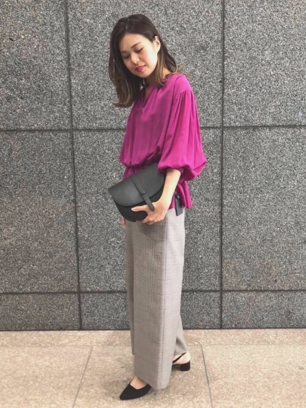 前後2wayで着れるブラウスをスキッパーの方で着ました。ブラウスの色が引き立つよう、他のアイテムの色を抑えました。 ブラウス(size:free) パンツ(size:36)
