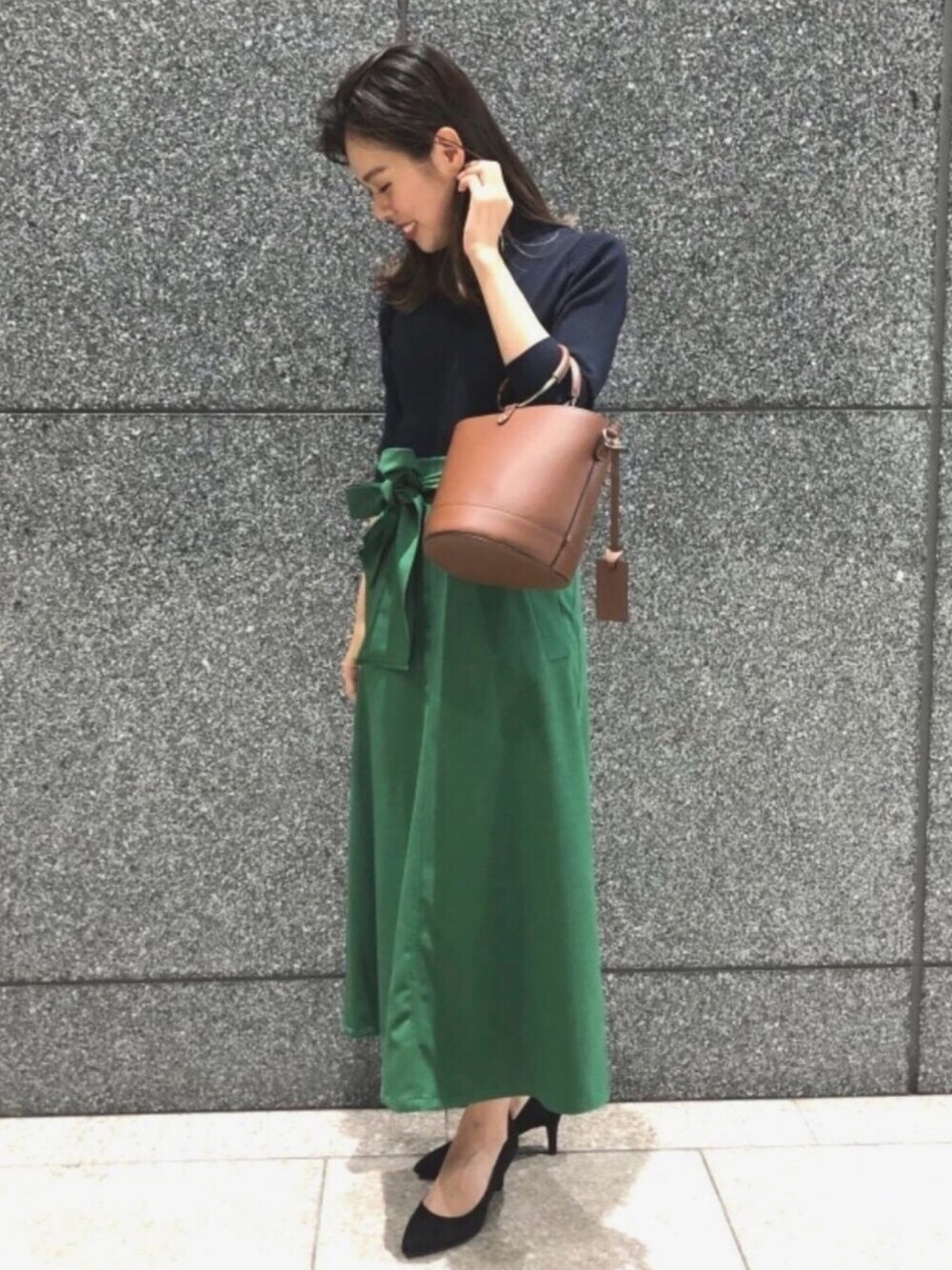 グリーンのスカートを秋らしく落ち着いたトーンのトップスと小物でまとめました。 トップス(size:free) スカート(size:36)