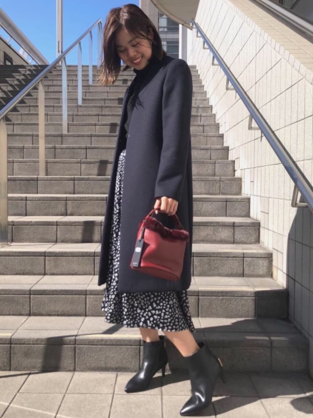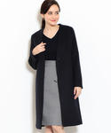 コートはシルエットがとても綺麗でスッキリとお召しいただけます。全体をブラックとネイビーでまとめ、バッグの赤をアクセントにしました。 アウター(size:38) ニット(size:free) スカート(size:36) ブーツ(size:M)