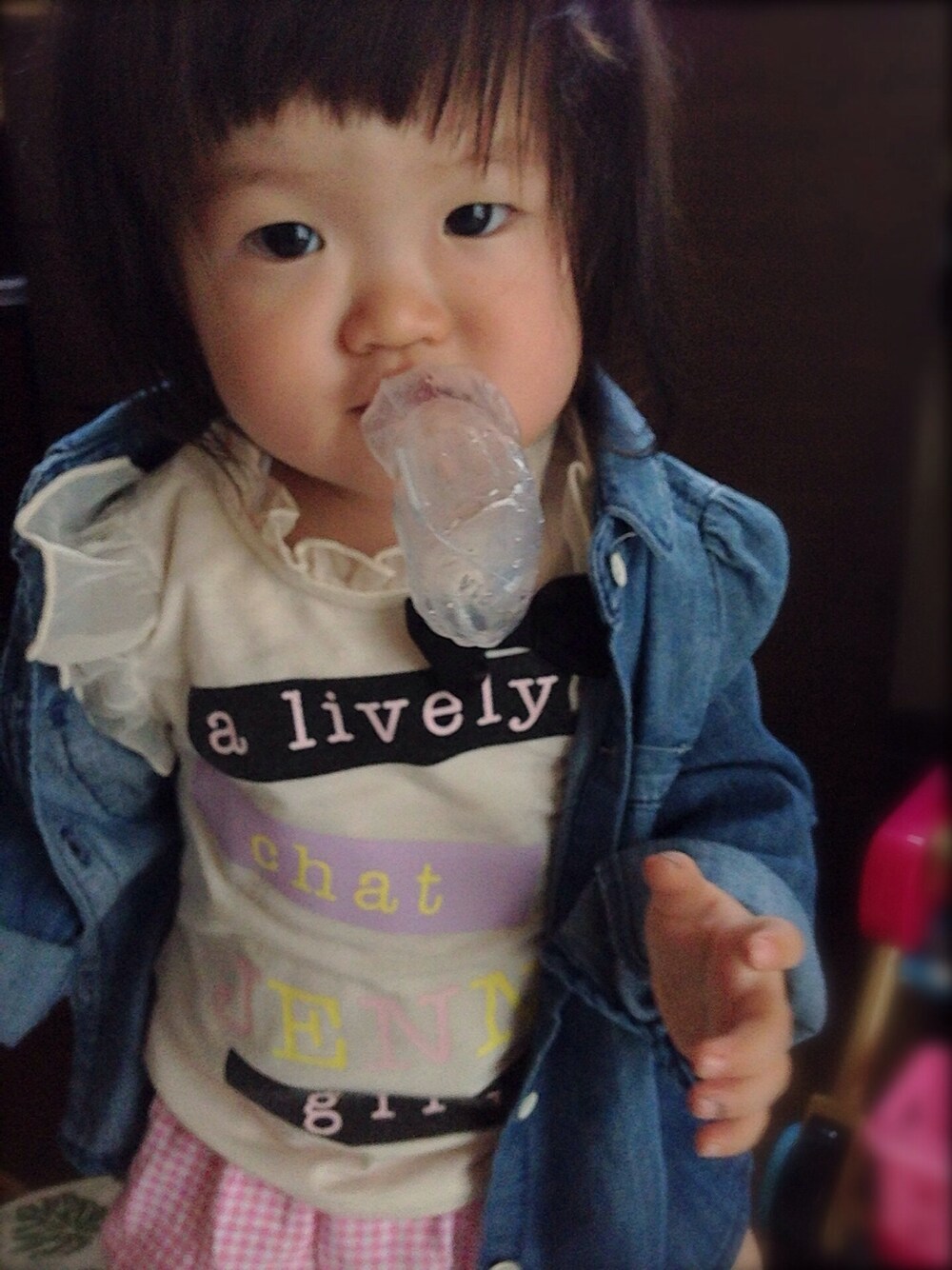 デニムシャツ着て欲しかったけど暑かったので部屋の中で羽織ってみました。 パピコは母がおいしくいただきました。 12ヶ月