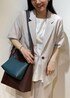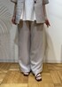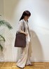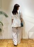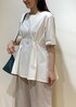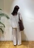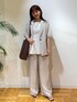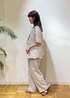 ベージュのセットアップの中のトップスがかわいいコーデです。