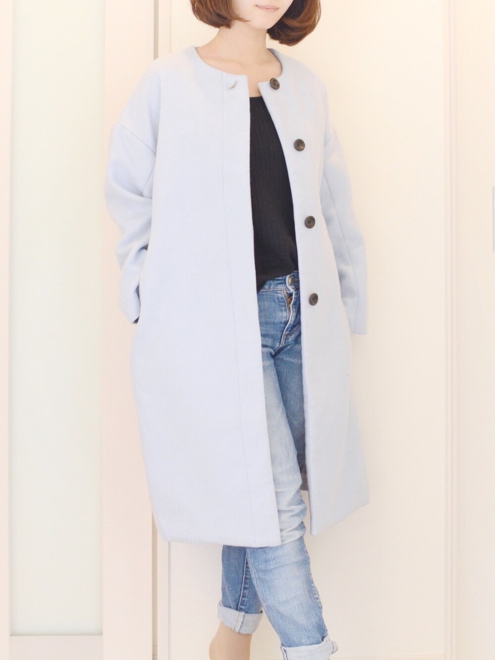 su(民)のノーカラージャケット「ノーカラーコート」を使ったコーディネート