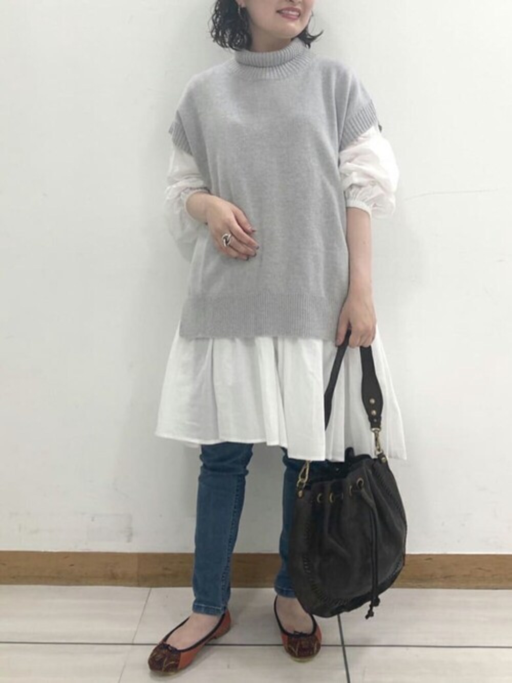 【knit】着用サイズ:F 柔らかい着心地のroberto collinのニット。 ブラウスやカットソーの上に重ね着するのが オススメです。 私の身長で腰周りが隠れる着丈です。 洗濯 :手洗い可 伸縮性:あり 透け感:なし 裏地 :なし 光沢感:なし 【blouse】着用サイズ:F 女性らしいシルエットのギャザーブラウス。 私の身長で膝くらいの丈感です。 ストレートパンツと合わせてゆるっと着るのもオススメです。 洗濯 :手洗い可 伸縮性:なし 透け感:あり 裏地 :なし 光沢感:なし 【bottom】着用サイズ:0 柔らかく伸縮性のあるパギンス。 ウエストだけでなく全体的に伸びるので 履き心地のよい1枚。 ピッタリとするのでチュニックやワンピースの下に合わせても使えます。 洗濯 :手洗い可 伸縮性:あり 透け感:なし 裏地 :なし 光沢感:なし 【bag】 CAMPOMAGGI/カンポマッジ 斜めがけと肩掛けのショルダーでお使い頂けます。 色ムラやシワ感、ヨレ感が独特のビンテージ感あるバッグです。 開き口は大きいので荷物の取り出しがしやすいです。 【shoes】着用サイズ:37(普段23cm) 柔らかい履き心地MEHER KAKALIAのシューズ。 つま先のビジュがアクセントに。 少し小さめのお作りなのでワンサイズあげた方が楽にはけて良いですよ。