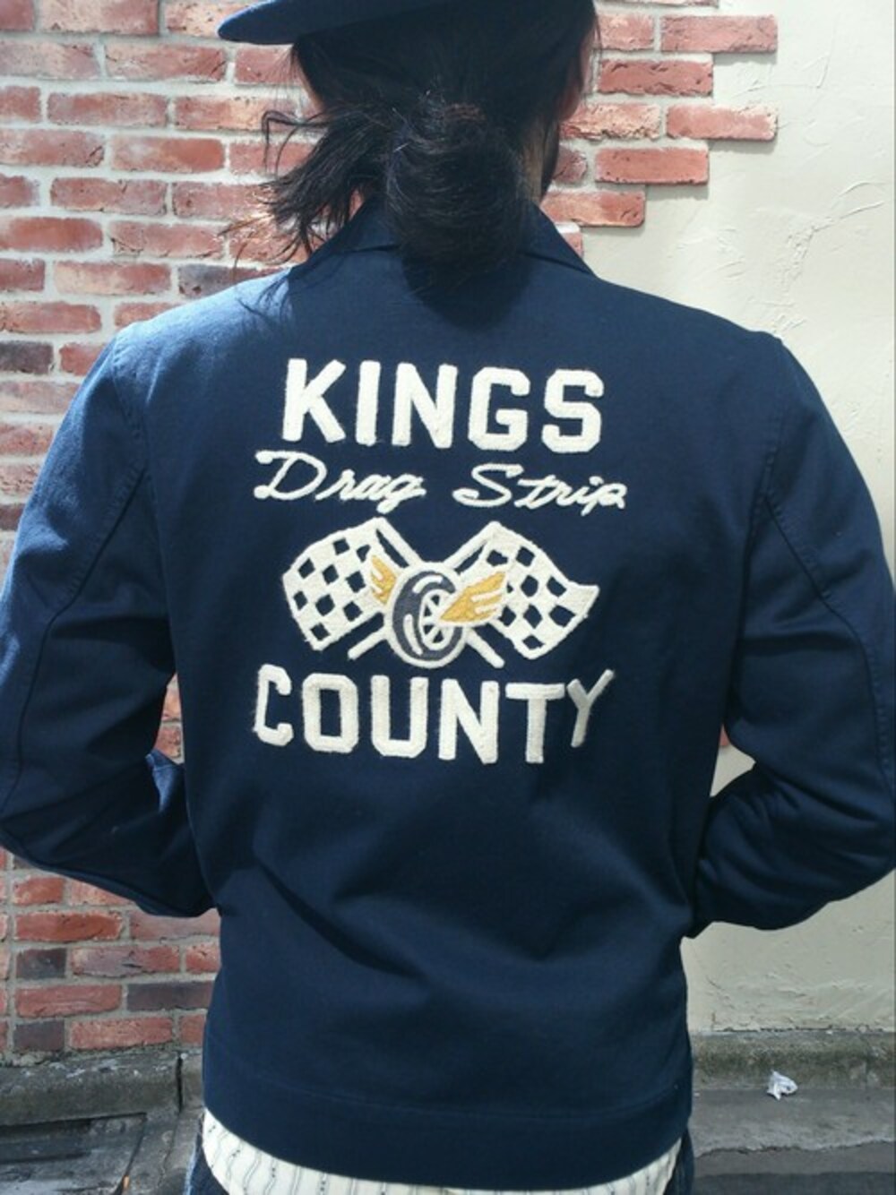 ブルー系のライダースジャケットを着用したメンズの春コーディネートの1枚目の写真