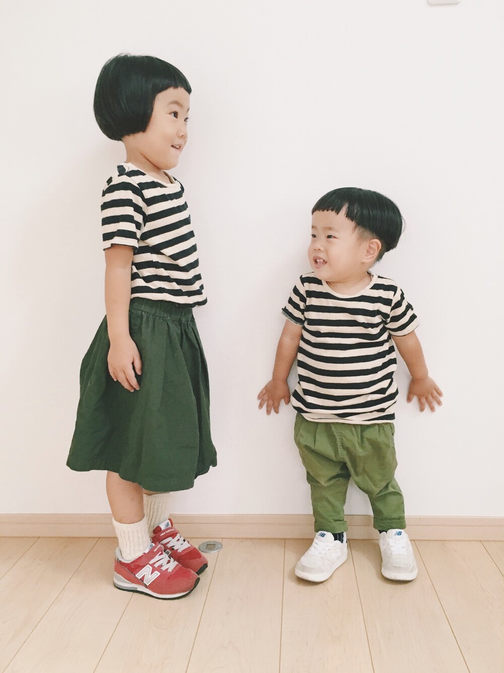 ボーダー×カーキ×ニューバランスのオソロコーデです 姉さん髪切って、みんなにクレラップって言われてる💇 切りすぎちゃってごめんね😂