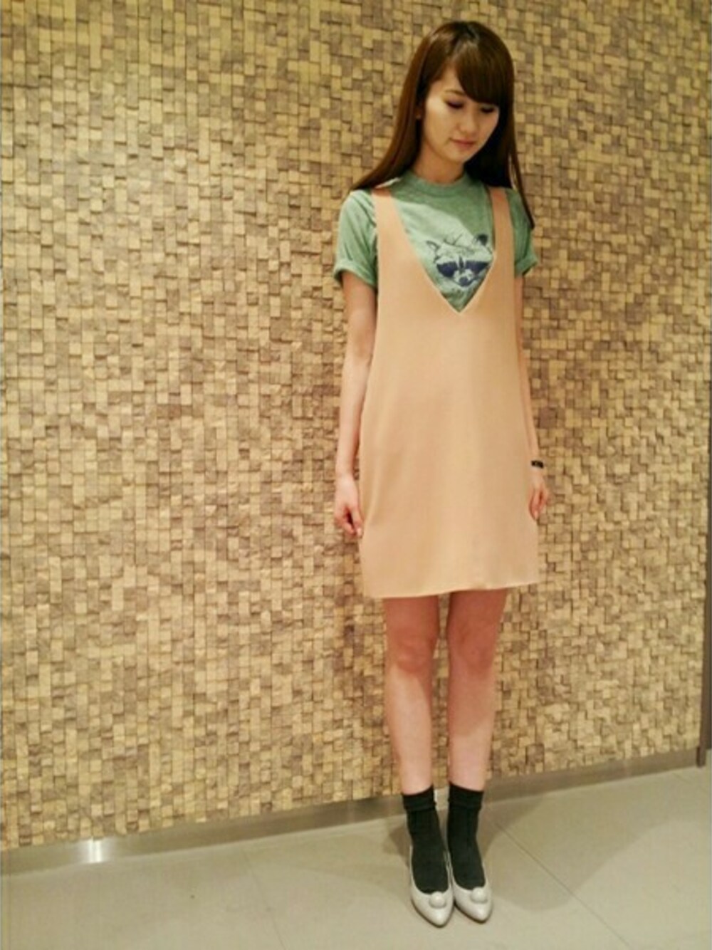 アーカイブラインのジャンパードレスにグリーンのアライグマTシャツでコーディネート。 玉モチーフのついたパンプスでモード感をプラスしました。