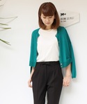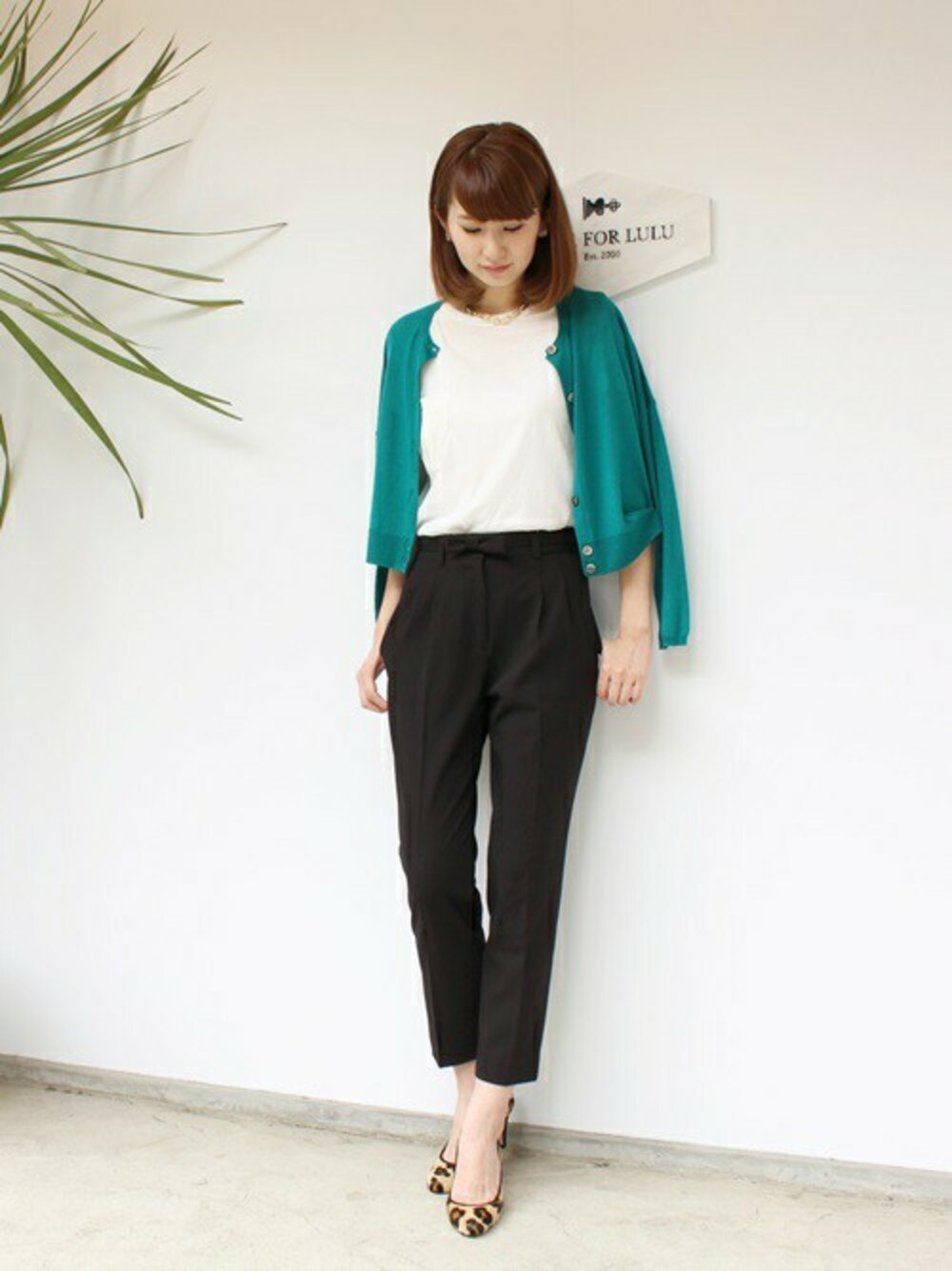 人気のリボンパンツはシンプルにTシャツと合わせてコーディネート。 さし色に綺麗なグリーンのカーディガンを肩から掛けて。 足元もレオパード柄でポイントに。 シンプルな大人コーディネートです。