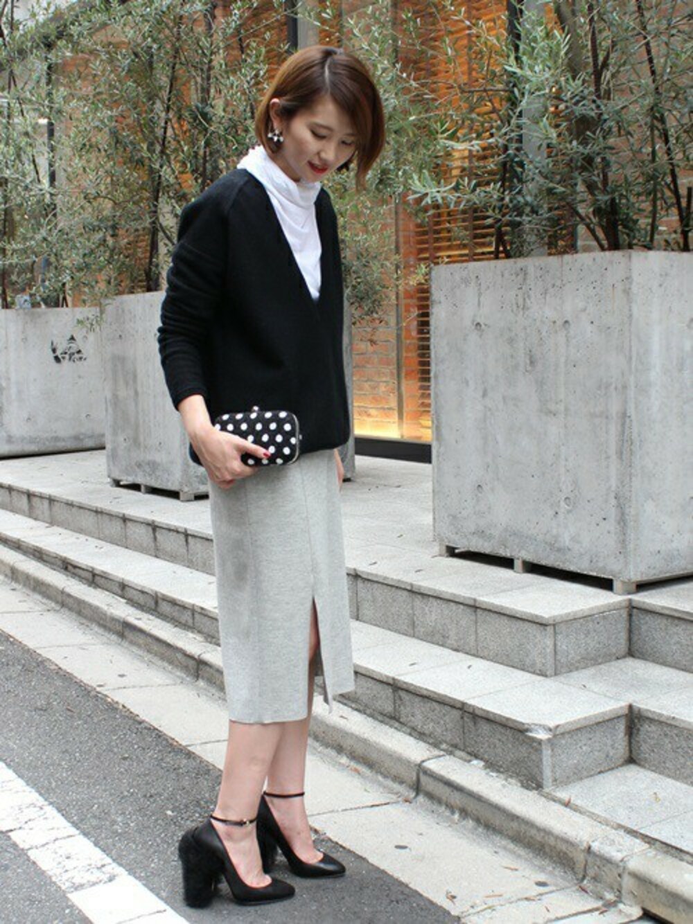 スリットが入ったスカートは薄手ウールジャージー素材でリラックス感ある一点。 ゆったりニットにタートルカットソーをレイヤードしました。 モノトーンでまとめたシックスタイルはバッグとシューズでプレイフルをプラス!