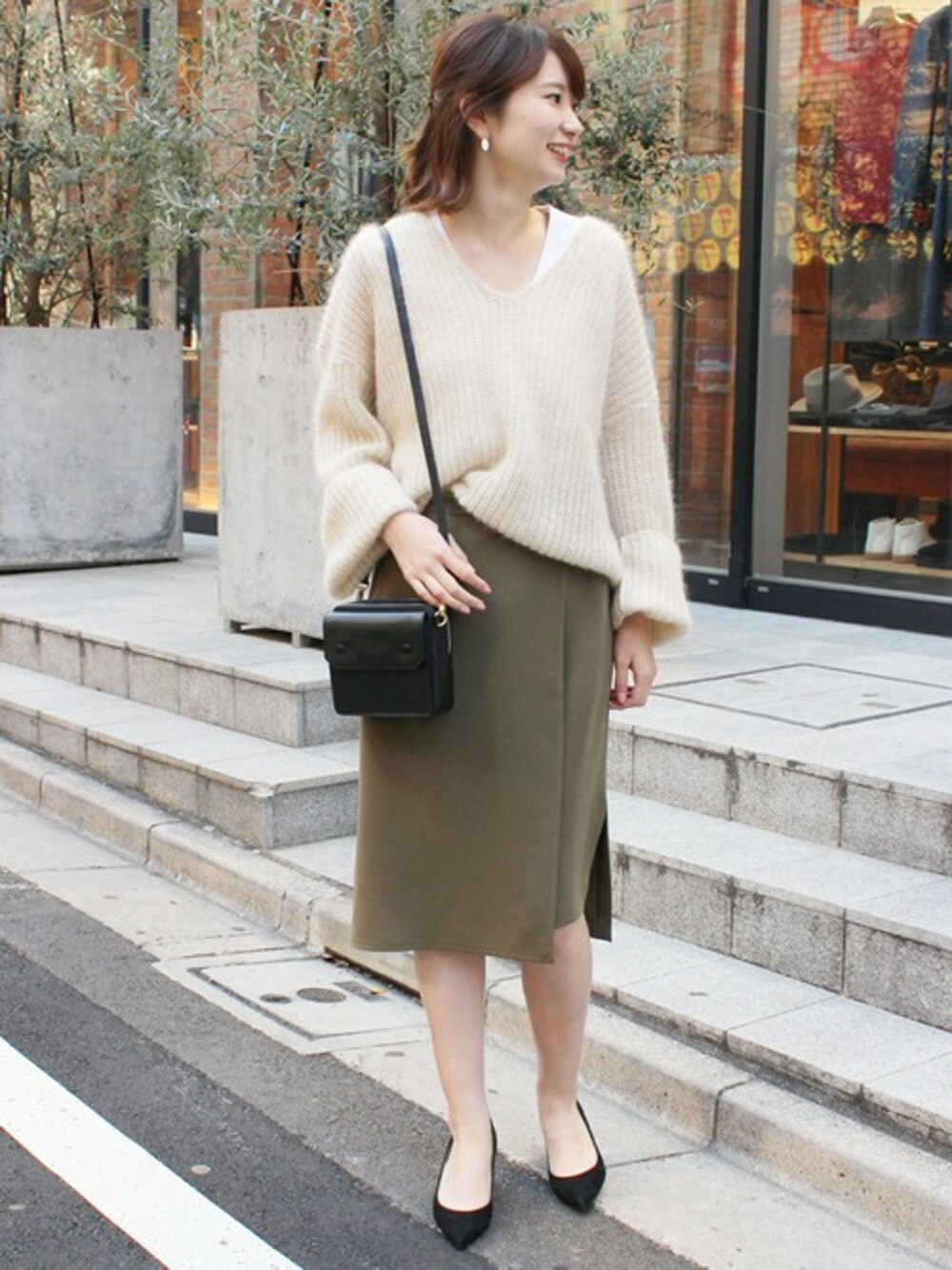 シンプルなカーキスカートはざっくりとしたニットと合わせて大人コーディネート。