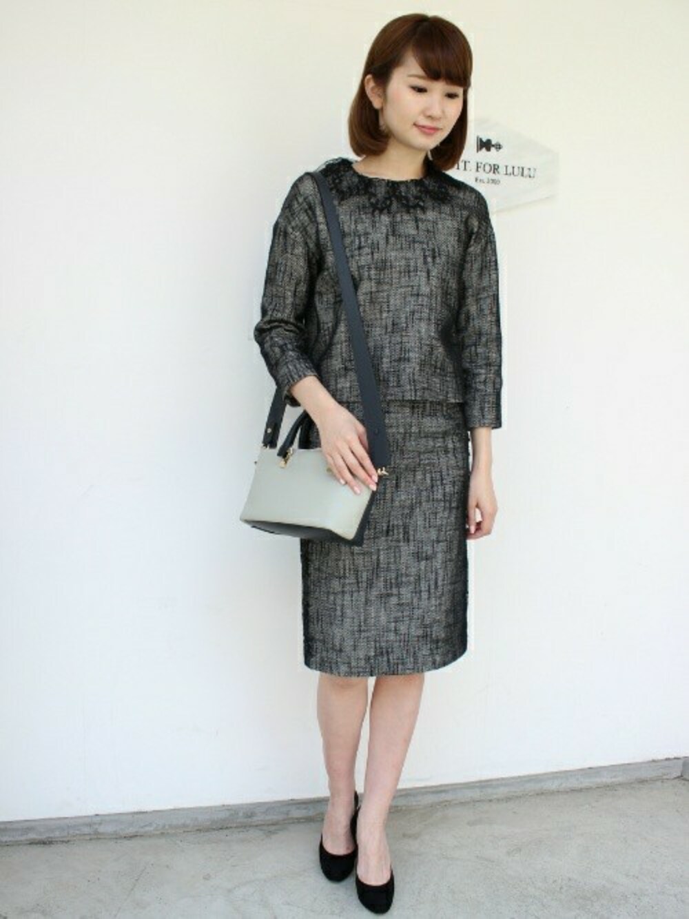 レースの襟が付いたツイードのブラウスを同じシリーズのスカートと合わせてセットアップに。クラシックな雰囲気漂うスタイリングです。