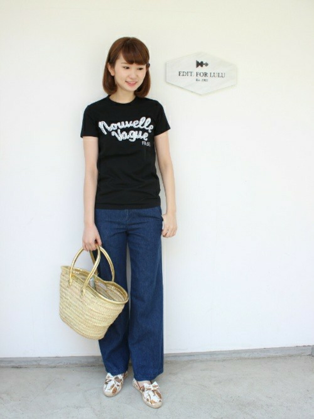 縄のような文字が可愛いTシャツにバギーパンツ、カゴバッグを合わせて夏先取りのスタイルに。