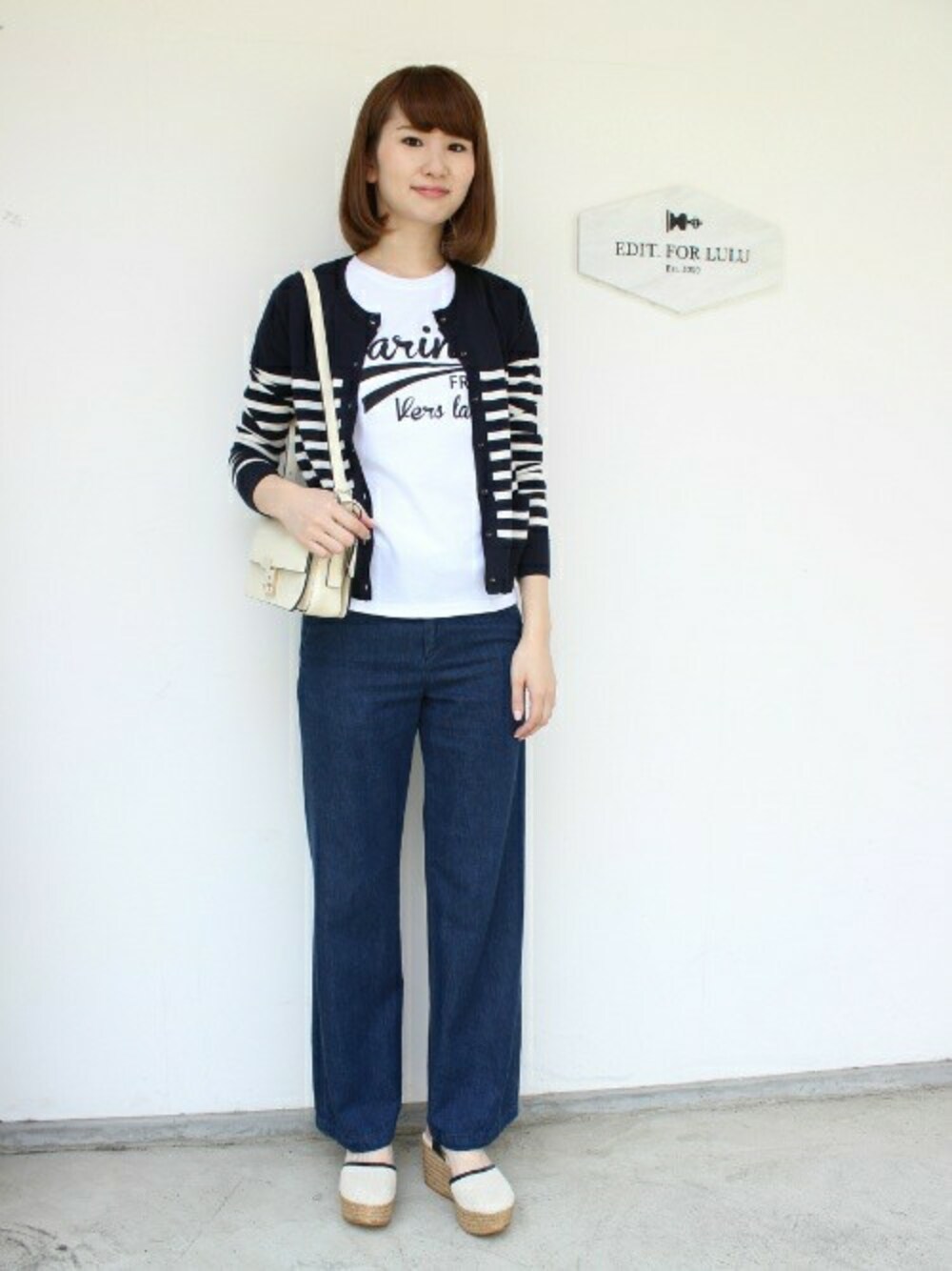 今季気になるマリンスタイルを取り入れました。上品なオフホワイトのショルダーにウェッジサンダルがポイントです。