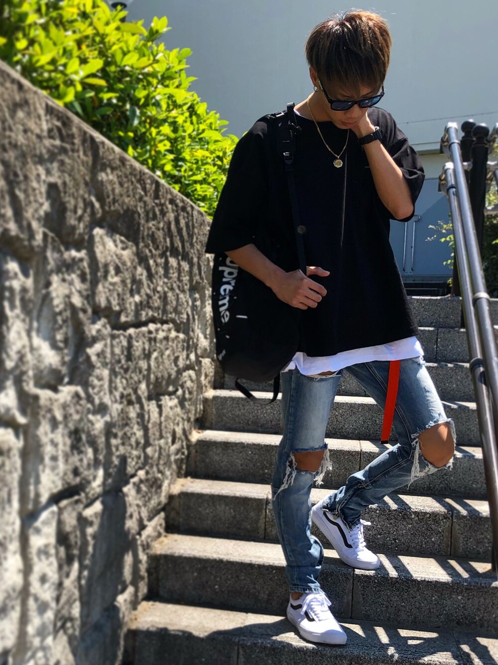 今日のコーデ。 前日投稿したGUのトップスの色違い! 質感も良く、お気に入りです! シンプルになりがちな夏ファッションに小物や ダメージジーンズにてアクセントを与えることで 主張感を得られます♪ 黒でまとめたファッションにも白スニーカーを履くことで 夏らしさを得られるので、おすすめです!