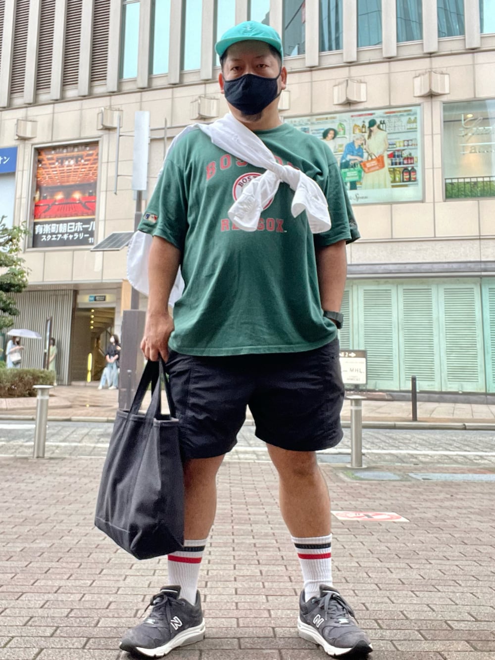 ブラックのショーツに、 グリーンのレッドソックスTシャツに、 エメラルドグリーンの二十GのCAPに、 ホワイトシャツ肩掛けに、 トリコロールのラインソックスに、 ブラックのトートバッグに、 チャコールグレーのNB CM1700を合わせてみました👍 と、身に付けてるもの羅列しただけです。 シャツとTシャツとソックスとトートは、 ペンギン バイ マンシングウェア🐧 (旧グランドスラム)です✌️