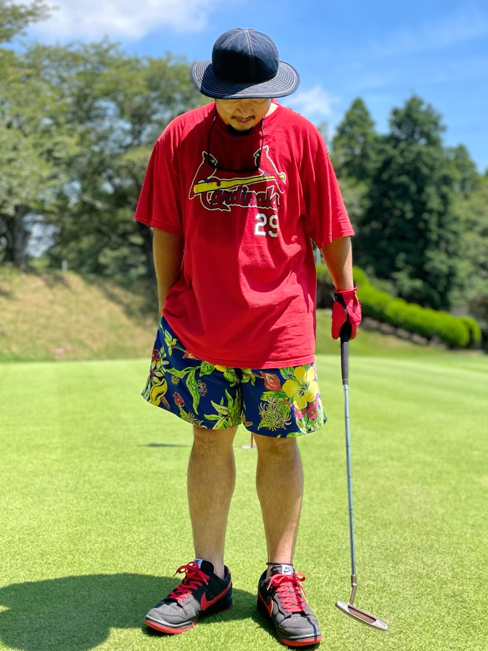 この夏1番の暑さです。って、 TVの天気予報で言ってた日🥵 ゴルフの先生のヤッさんと2人で ショートコース行ってきました🏌🏼♂️ ショートコースなんでドレスコードなし。 なので、MLBのカージナルスTシャツに、 お気に入りのラルフのスイムショーツ🐎 シューズはダンクにゴルフキックスを ドライバーでネジ込みました👍 夏のゴルフは危険ですね〜🤯 暑過ぎて暑過ぎて死ぬかと思いました。