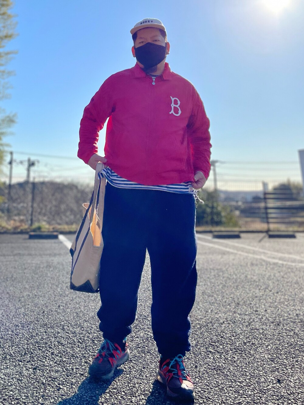 そりゃ、逆光で撮ったら こうなりますよね〜😅 ボーダーのモックネックに、 シャカシャカの赤のスウィングトップに、 ボアフリースパンツです✌️