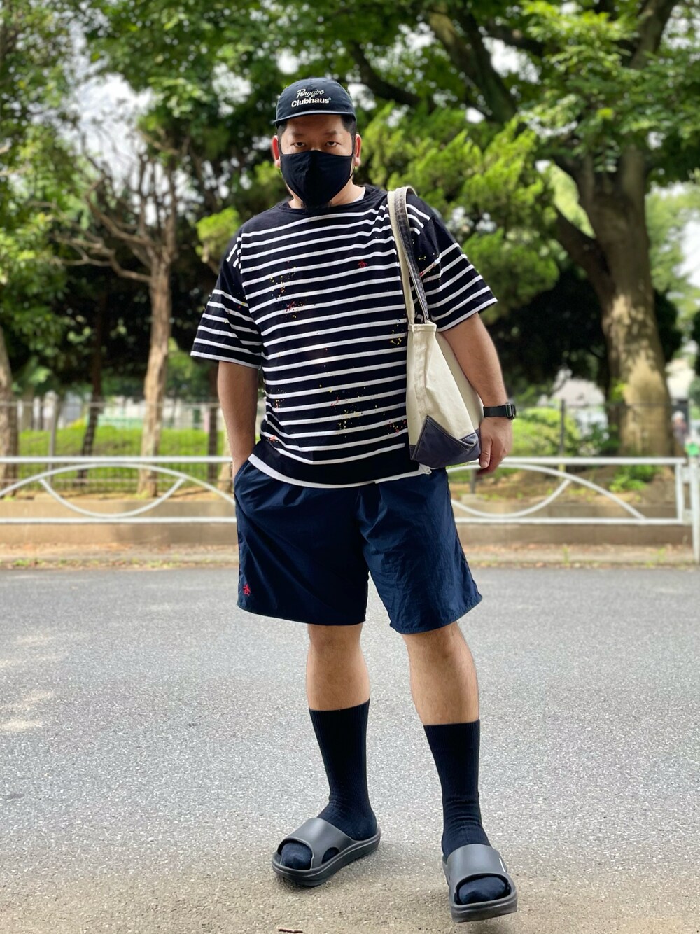 黒系ボーダーおじさんです。 リカバリーサンダル、楽ちん過ぎて 他履けなくなっちゃいました😅