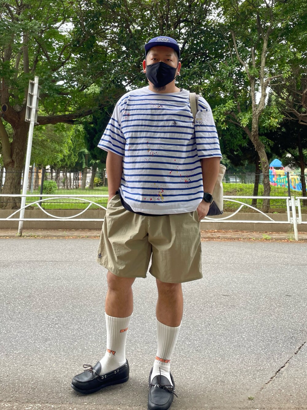 ベージュのバギーショーツを新たにゲットしたので、 ボーダー合わせのさわやかコーデです👍 L.L.B eanのモカシンも良い感じです✌️