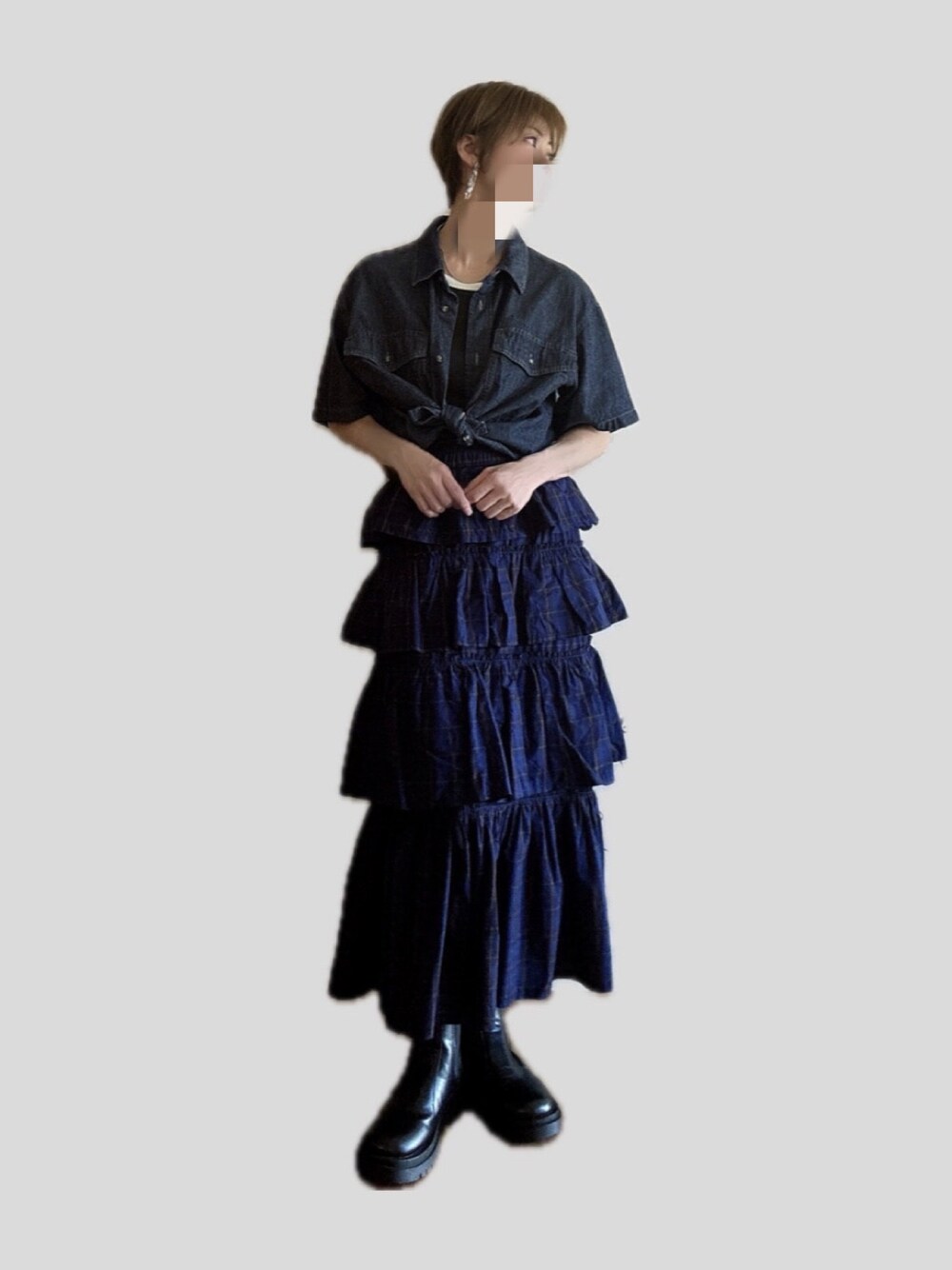 Availの個性的なスカート 3回目着回し GUのデニムシャツと合わせる そのまま着るとバランスが悪かったので シャツの裾をちょこんと結んだ˙ᵕ˙