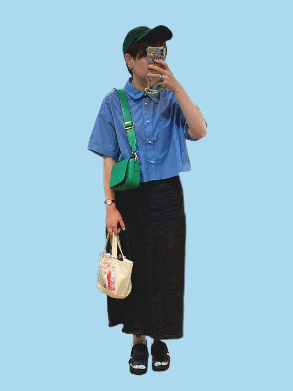 7月のコーデ🧢 キャップは多分同じアイテムだけど、 これはしまむらで買ったもの😂 きれいめのトップスとバッグに、 デニムスカートとキャップでカジュアルに✌︎