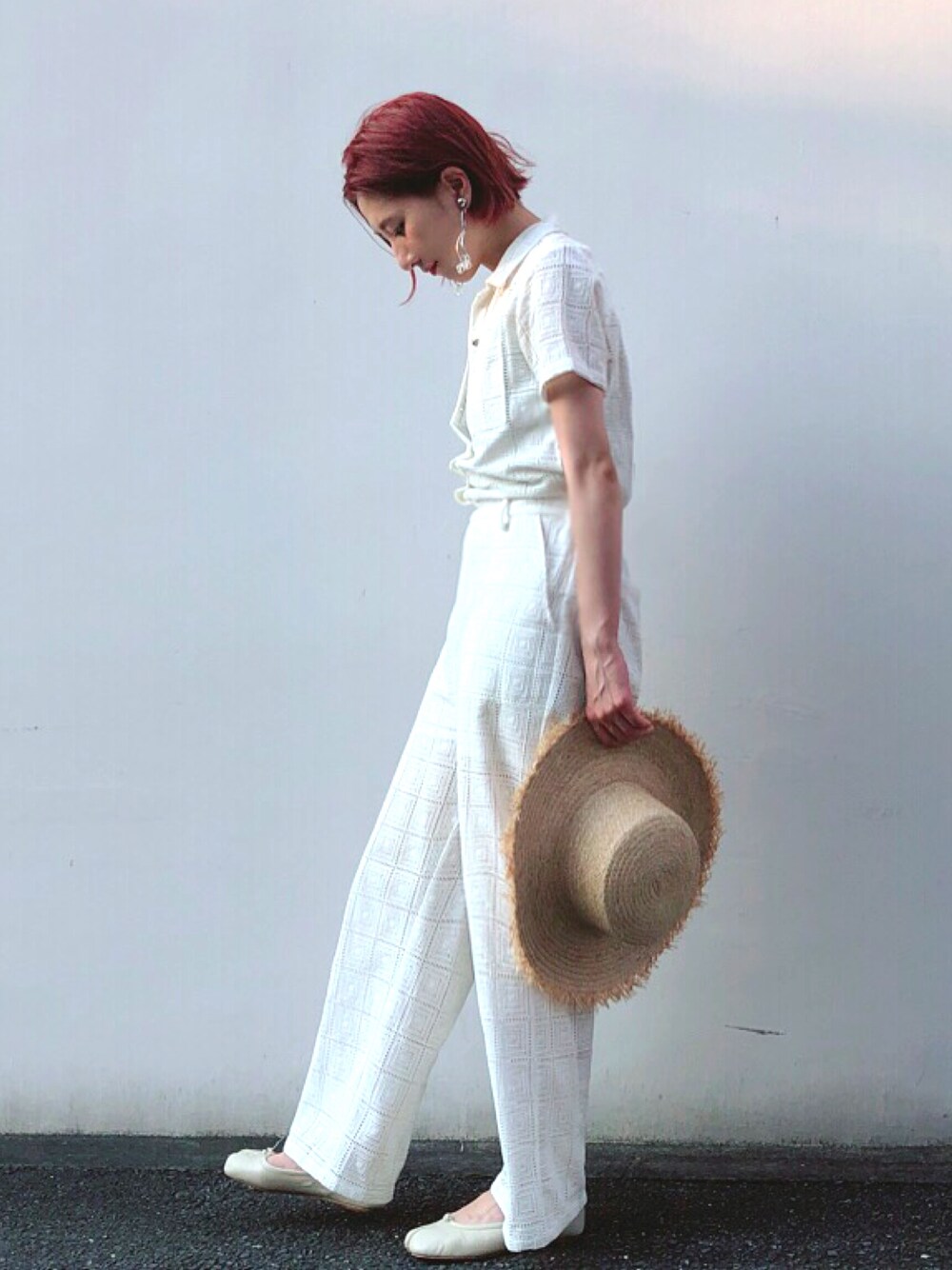 総レースのオールインワンに 小物使いで格上げ👩🏻🎨👑 クリスタルのイヤリングとストローハットで夏らしく🏝
