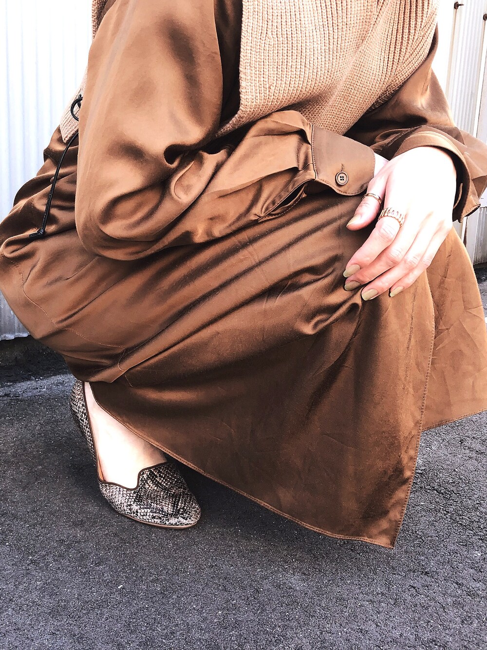 ブラウンコーデには馴染みのある ゴールドアクセを合わせて シックな装いを🌰 足元はパイソン柄でスパイス🐍