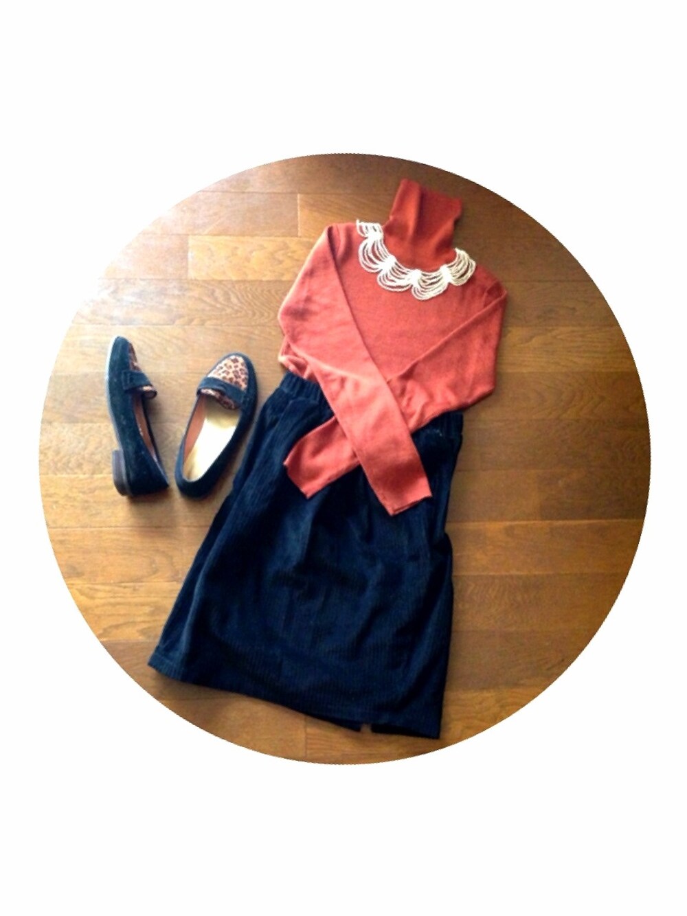 タートルネックニット(無印良品) × ビーズ衿 × コーデュロイタイトスカート おすましコーディネイト(^O^)