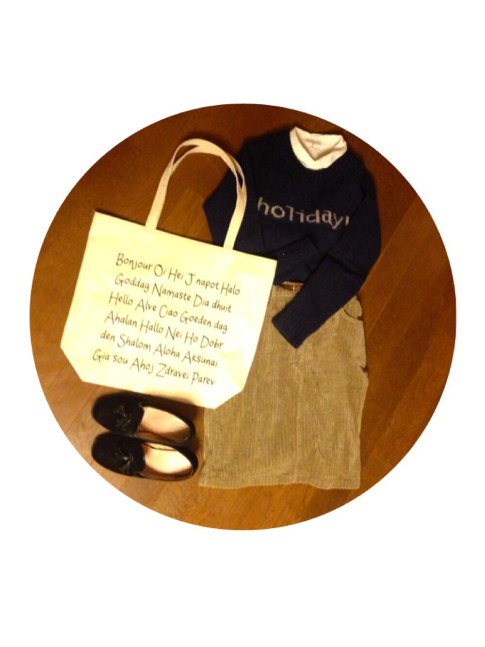 白シャツ × holidayセーター × コーデュロイスカート holiday(^O^)☆ どれくらい雪、降るのでしょうか…