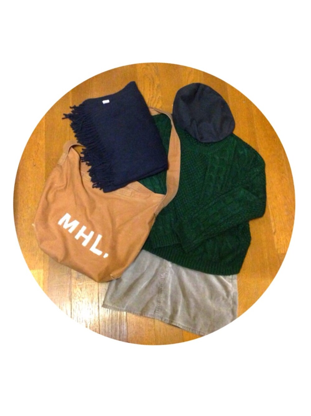 ぼうし × ざっくり編みセーター × コーデュロイスカート × 紺ストール スカートの色がお気に入りです(^O^)