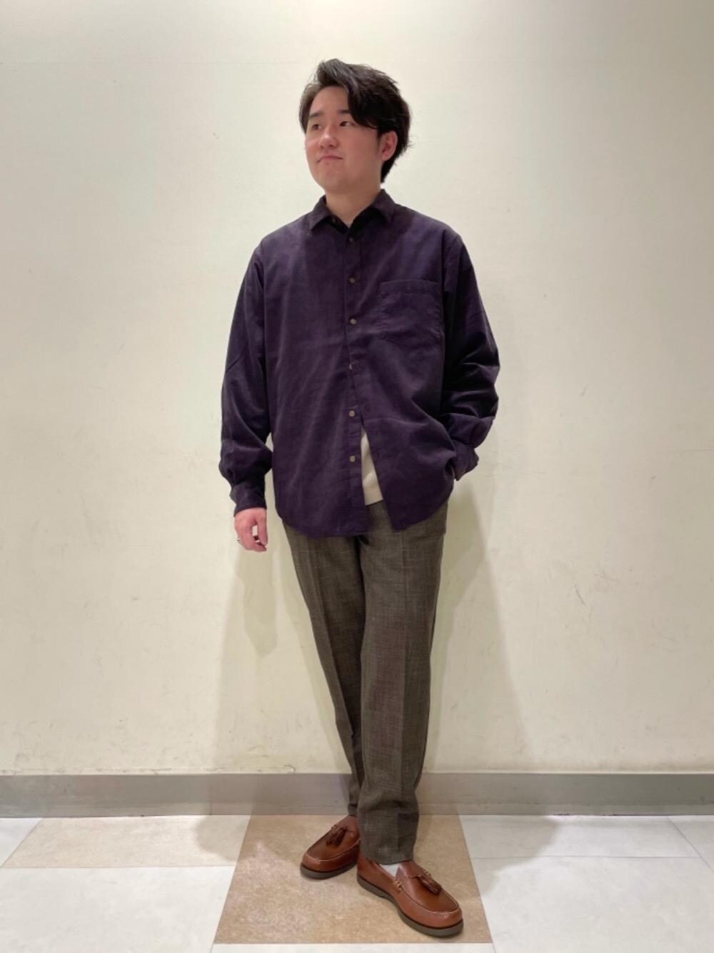 【20代後半】 【身長:170cm】 【普段サイズ】トップス&パンツ:ジャストはMサイズ、大きめに着るときはLサイズ/シューズ:26㎝ 【サイズ感】 シャツ:ゆったり カットソー:標準 パンツ:ややゆったり パープルのコーデュロイシャツを主役にブラウン系のアイテムたちでまとめた秋にぴったりのキレイメカジュアルコーデです。