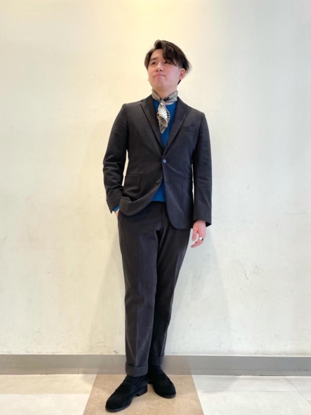 【20代後半】 【身長:170cm】 【普段サイズ】トップス&パンツ:ジャストはMサイズ、大きめに着るときはLサイズ/シューズ:26㎝ 【サイズ感】 ジャケット:標準 ニット:標準 パンツ:標準 落ち着いたグレーのコーデュロイセットアップに明るめなコバルトブルーのニットセーターを合わせた色映えコーディネート。首元にスカーフを巻いて上品さをプラスしています。
